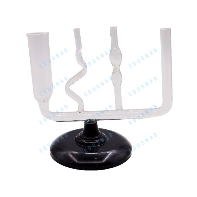 Четыре вертикальных стеклянных трубки различных форм, соединенные горизонтальной стеклянной трубкой, наглядно показывают, что уровень жидкости остается одним и тем же вне зависимости от формы сосуда